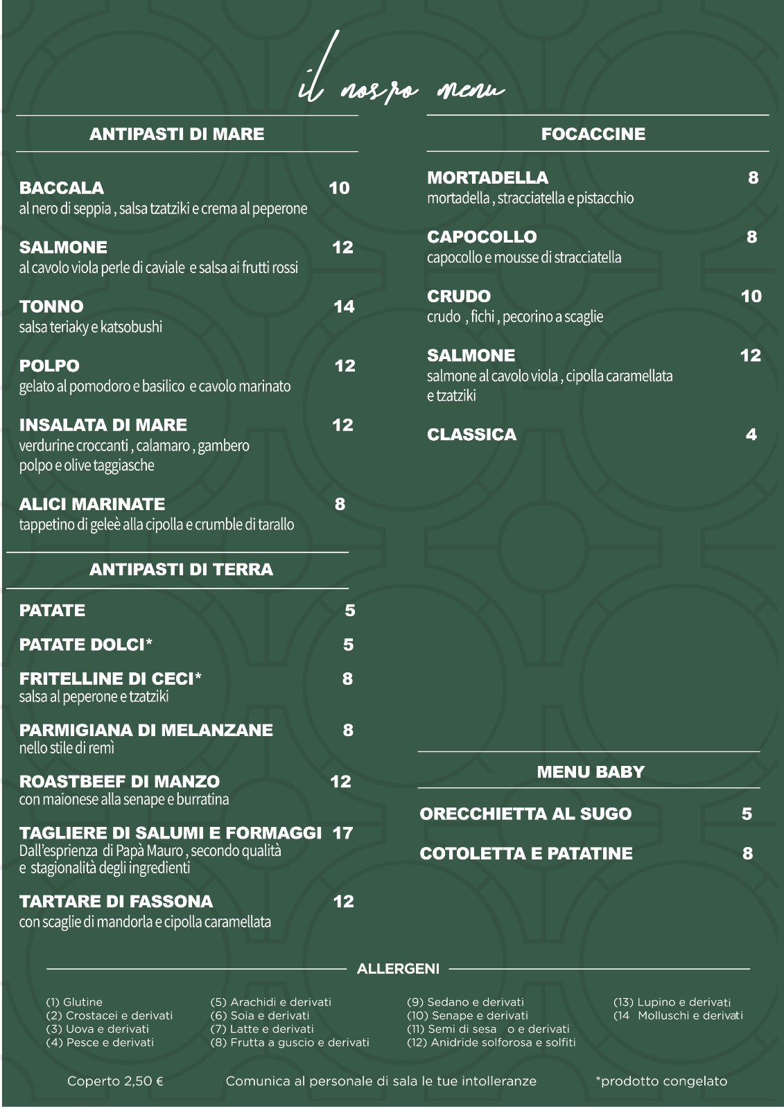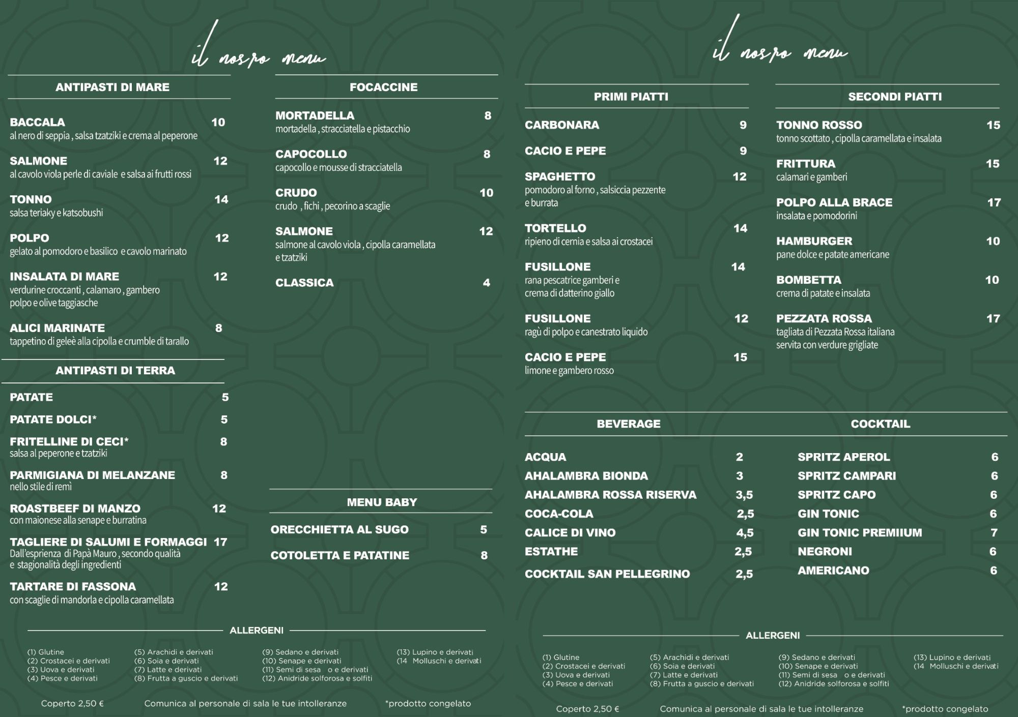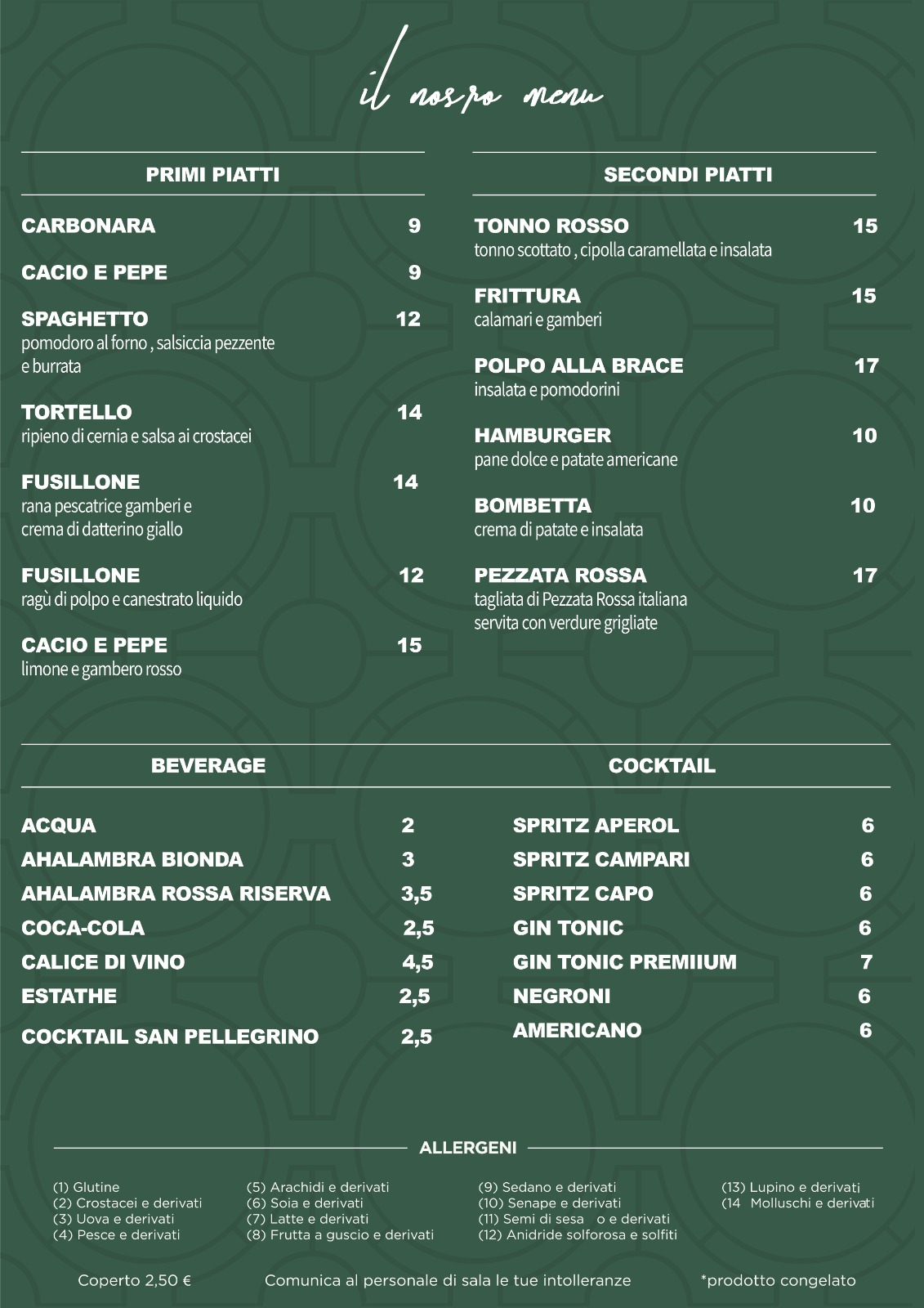 Possibilità di menù degustazione a partire da €40,00 a persona, vini e acqua inclusi.